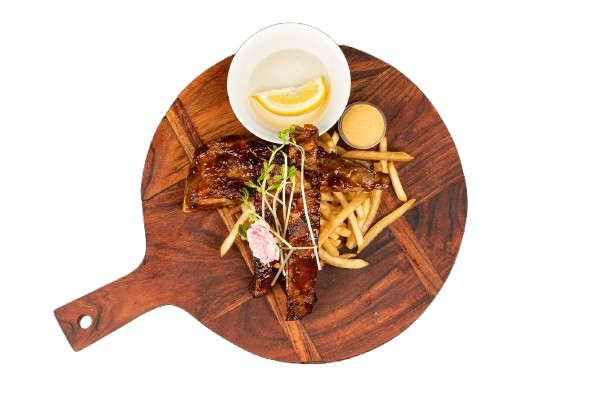 Savor the juiciest pork rib delight! These tender ribs practically fall off the bone, served with golden fries, a crisp green salad, and a side of chipotle mayo.